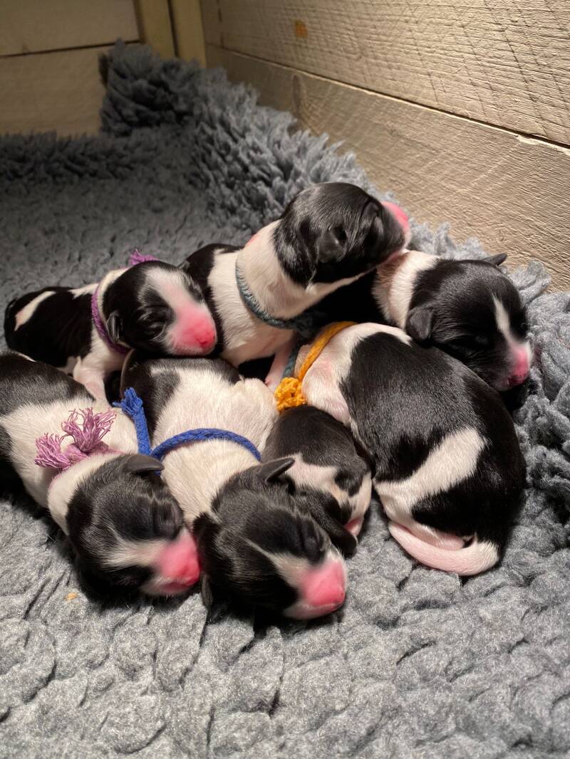 Op 3 april 2017 is Jet bevallen van een prachtig nestje met gezonde pups. Het zijn 5 teefjes en 2 reutjes. De bevalling leek niet heel lastig te zijn voor Jet, maar hij duurde wel lang. Ze begon rond 3:00 en de laatste pup kwam als verrassing nog rond 14:00. Jet was gelijk heel zorgzaam viel ons op. Omdat dit haar tweede nest is lijkt ze veel beter te weten wat ze moet doen. Een ervaren moedertje.